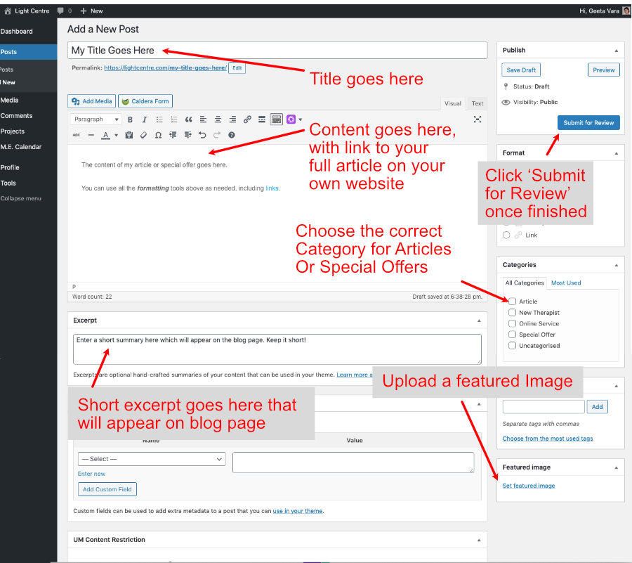Step 3: Create your article/summary or Special Offer, giving it a Title, Summary description, Excerpt, Category and Image.