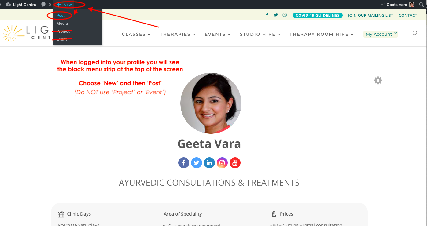 Step 2: Log in to your profile and from the top menu select ‘New‘ and then ‘Post‘.